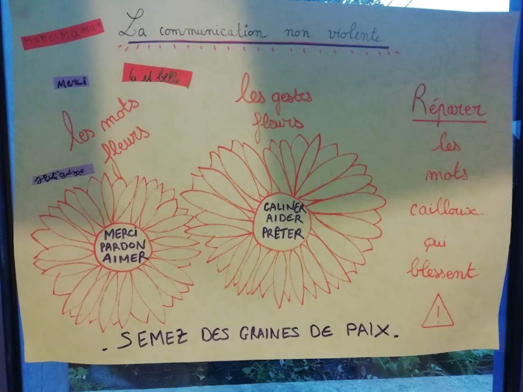- Des ateliers visant les compétences psycho-sociales à l’école (la concentration pour mieux apprendre, l’importance d’écouter ses émotions, la Communication Non Violente, la gestion du stress)
